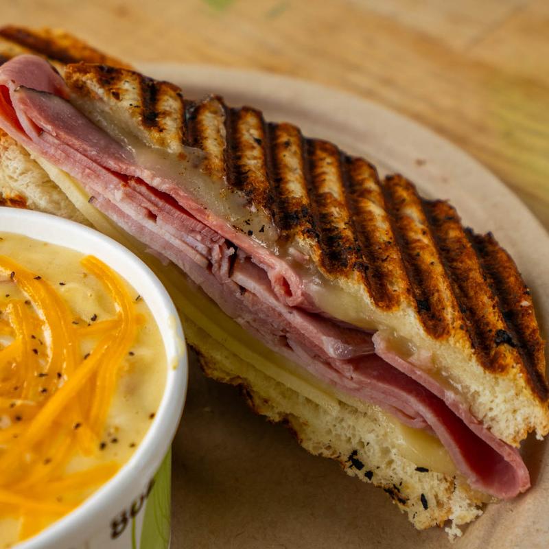 Indulge in a warm and toasty ham and Swiss panini, featuring layers of savory ham and melted Swiss cheese, complemented by crisp lettuce, fresh tomato, and a zesty garlic aioli. Grilled to perfection, this panini offers a delightful crunch and gooey texture in every bite!