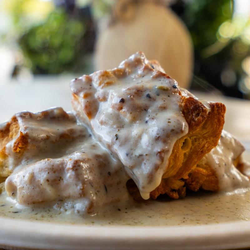 Fluffy, homemade biscuits smothered in rich, savory, house made, country gravy.